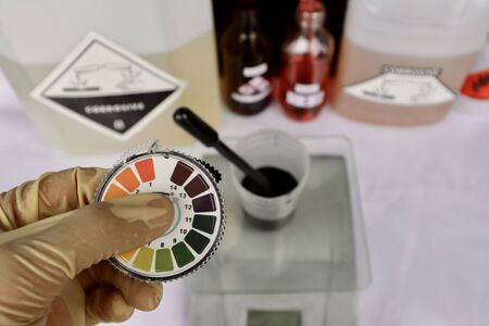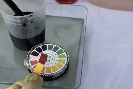 A sample of acid being assessed with a pH color-fixed indicator stick.