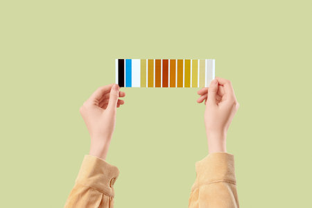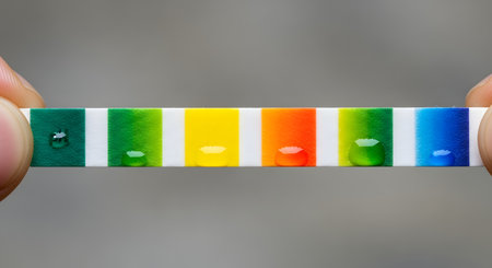 A person holds a universal indicator or pH test strip between their fingers, showing a range of colors from green to blue. Droplets of a liquid have been applied to the colored pads to test its acidity or alkalinity. This image represents scientific testing, chemistry, water quality analysis, and precise measurement.