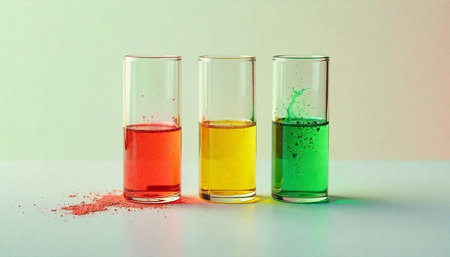 Three colorful liquids in transparent glass tubes, abstract arrangement