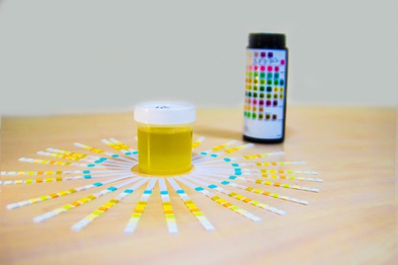urine sample along with dip stick uristix for analyzing urine glucose protein in diabetes