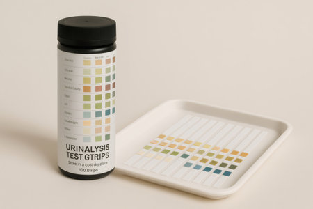 Urinalysis test strips are fanned out on a white tray, showing the color variations resulting from a urine test, alongside the labeled container