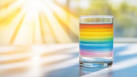 Colorful refractions from glasses create a stunning rainbow effect on a rustic wooden table, enhancing the creative atmosphere of the room.