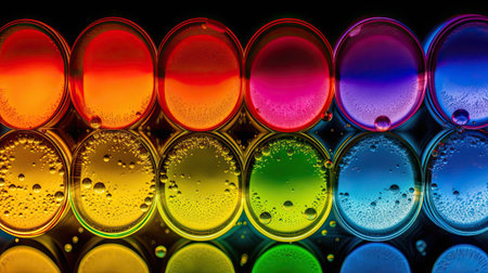 A row of test tubes filled with various colorful liquids is displayed. The tubes are arranged in a holder, showcasing a range of hues. The image features a shallow depth of field, highlighting the liquids' colors. This setup is suitable for illustrating science, research, or chemical analysis concepts, and is appropriate for educational or commercial purposes.