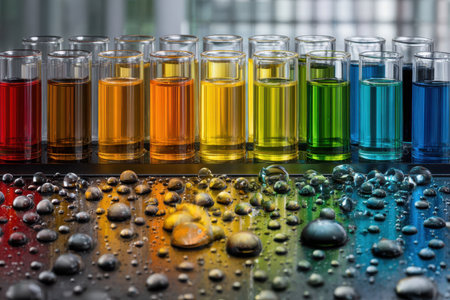 Vibrant colored liquids in a sleek modern laboratory setting on a stylish and organized desk