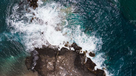 Aerial shot from drone. Top view on the rocky ocean shore. Blue Waves of the Pacific Ocean is crashing on the rock. White sea foam. Volcanic beach of Tropical Island Oahu Hawaii.
