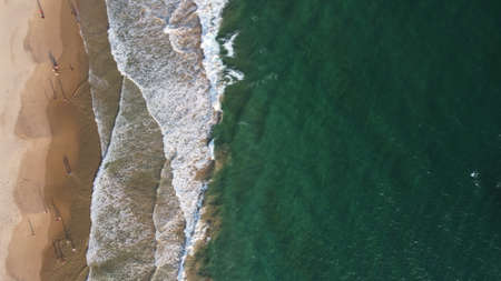Aerial view sandy beach and waves Beautiful tropical sea in the morning summer season image by Aerial view drone shot, high angle view Top down sea waves