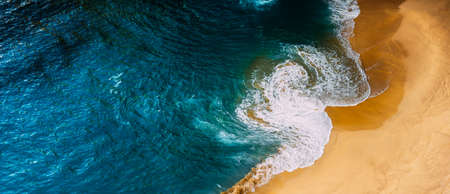 Top view from sky of sea wave and sand beach landscape with outdoor sun lighting.