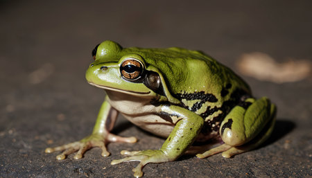 A vibrant green frog sits calmly on a wet surface, showing its striking features under low light.