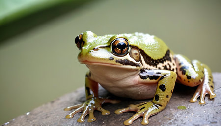 A frog with beautifully curious eyes is perched on a rugged rock, observing its surroundings intently. This close-up highlights its vibrant eyes and unique texture, set against a serene background.