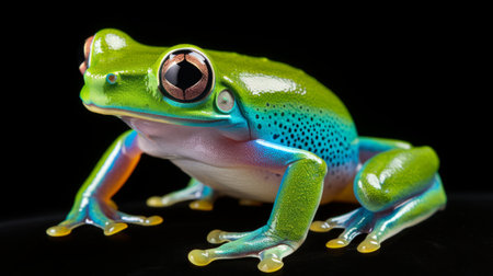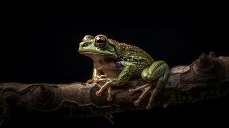 A wide-eyed frog perched on a sleek black rock, Ai-generated.