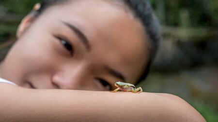 Asian woman looking and holding a small forest frog toad close-up. People interacting with little wild reptile animal in Taiwan. Tiny baby of Hyla Chinensis tadpole. Care of environment concept.