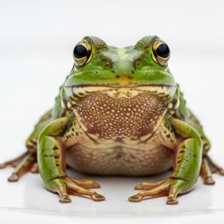 A vibrant green tree frog stands out against a clean white background, showcasing its unique features and texture.