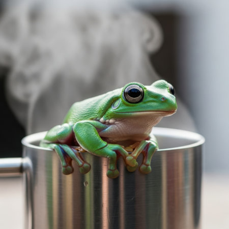 A small green frog is perched on the rim of a steaming mug, seemingly enjoying a moment of warmth and comfort. The frog's large, expressive eyes and relaxed posture give it a content appearance. The steam rising from the mug suggests that the drink inside is hot, creating a cozy and whimsical scene.