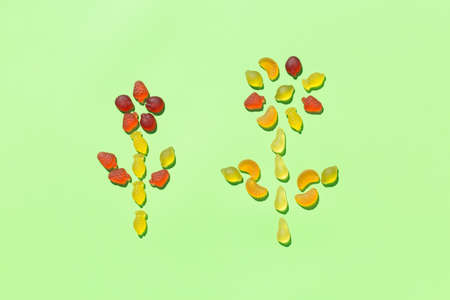 Jelly fruit candies, sweets in a form of flowers on a mint green background. Kids arts and crafts, creative artwork, diy, fun selftime, education, learning concept