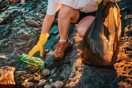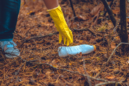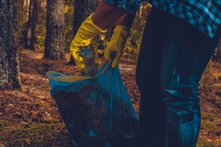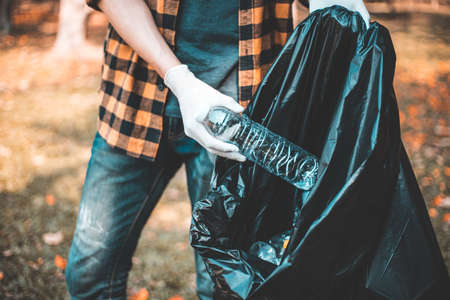 A gloved hand picks up a plastic bottle from the ground and places it in a trash bag. A volunteer man removes trash scattered in the forest. Eco, saving nature, eco activism.