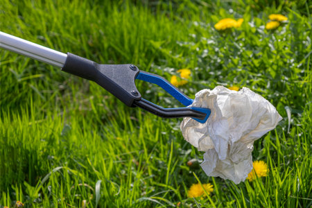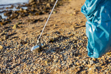 Close up photo of a man collecting garbage with a grabbing tool on the beach