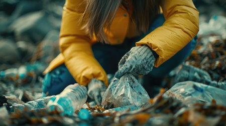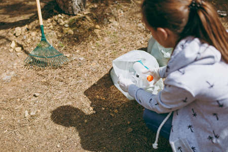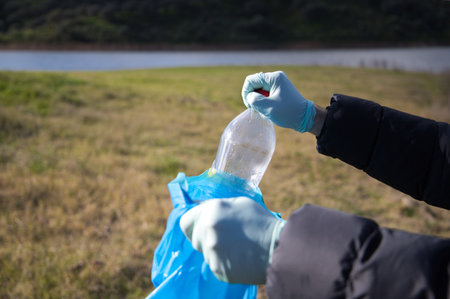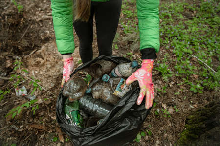 Detail of a volunteer's hand picking up plastic bottle from the forest and putting in the plastic bag. Concept of Earth Day and World Environment Day June 5.