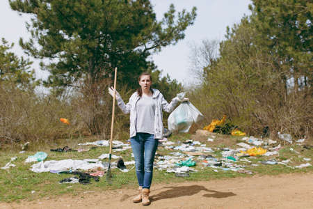Shocked woman in casual clothes cleaning holding trash bags and rake for garbage collection in littered park. Problem of environmental pollution. Stop nature garbage, environment protection concept
