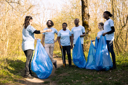 Group of nature activists collaborating to clean the woods area from trash, prepared with instruments and disposal bags. Diverse people fighting illegal dumping, ecosystem responsibility.