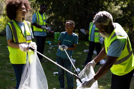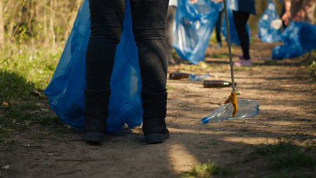 Diverse activists group using claw tools to grab trash and plastic, storing it in garbage disposal bags. People gathering to collect rubbish and recycling for sustainable lifestyle. Camera A.