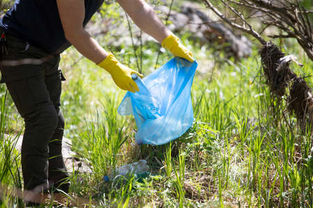 Man in yellow gloves collecting plastic garbage in trash bag in the park. Environmental protection. People and ecology. Save nature.