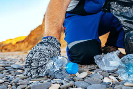 earth day. Volunteer picks up a plastic bottle on the beach. close up of hand. The concept of cleaning the coastal zone.