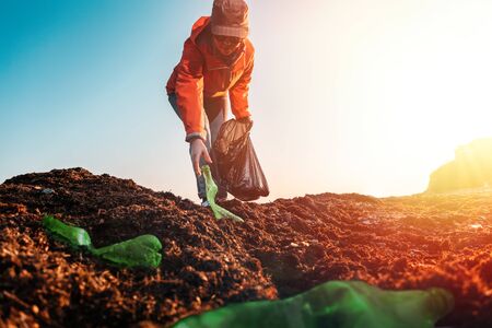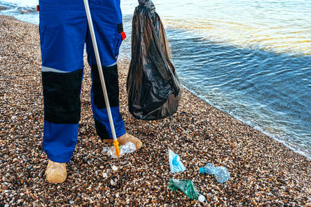 A man volunteer collects garbage on a dirty beach. The concept of waste recycling, environmental cleaning.The concept of waste recycling, environmental cleaning