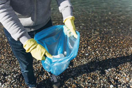 Hand of a man volunteer grabbing plastic litter into a waste bag cleaning up the beach