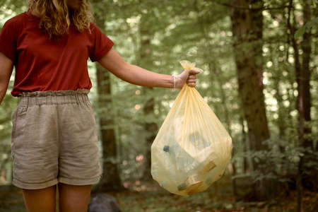 Female hands in gloves hold a garbage bag with garbage collected in the forest. A woman volunteer removes trash in the park. Saving nature from garbage, eco activism, ecology, planet pollution.
