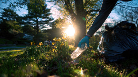 Close-up of sanitation worker's hands picking up litter from park lawn in natural sunlight