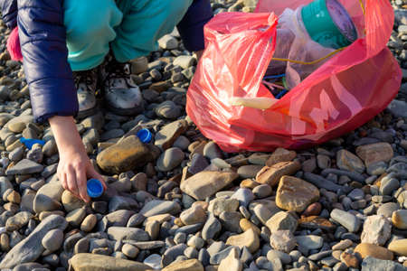 A female volunteer is collecting plastic garbage on the seashore. Cleaning of the coastal zone.