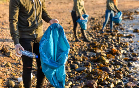 Volunteer activist puts a plastic bottle in a garbage bag. close-up. top view. The concept of environmental conservation and coastal zone cleaning.