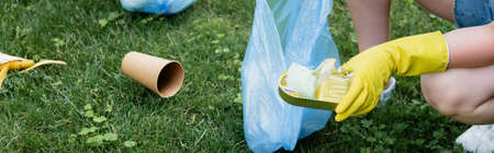 Cropped view of woman holding tin can and garbage bag outdoors, banner