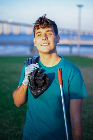 Excited eco volunteer standing for camera after collecting rubbish outside. Young man holding rakes, full plastic bag and smiling. Eco activist concept