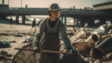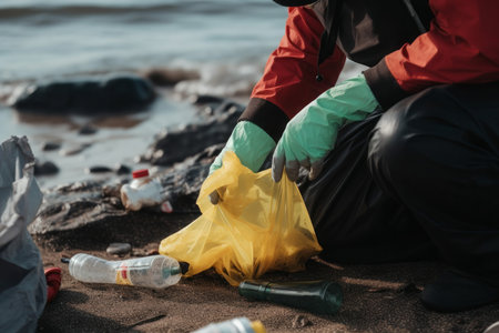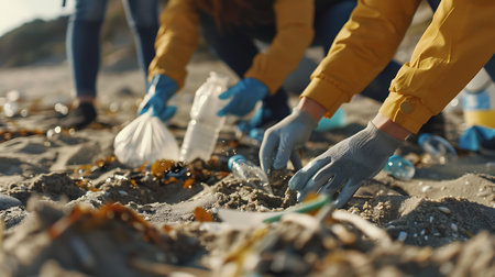 Volunteers cleaning up plastic waste from a polluted beach, showing efforts to combat environmental pollution Generative AI