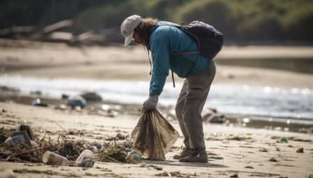 A person participating in a beach cleanup, with a focus on the amount of trash and the impact it has on the environment.