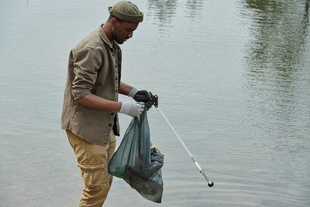 Young adult Black man cleaning riverbank using litter picker and holding garbage bag, standing near water and collecting trash, participating in environmental cleanup activity outdoors