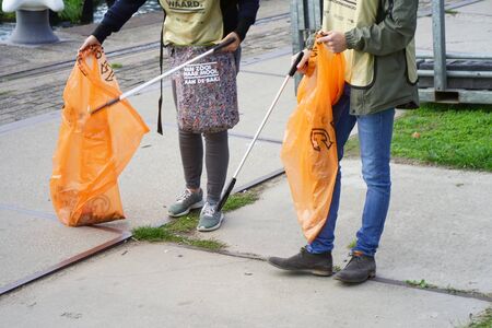 People collect garbage in bags on the streets of Rotterdam. Volunteers collecting garbage in park and street in town. Concept of environmental protection. 7 September 2018. Rotterdam. Netherlands