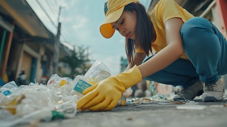 Volunteer woman picking up plastic rubbish in the public park. Cleaning environment concept