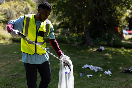 African American man picking up litter in park with metal picker and plastic-lined bag, copy space. Volunteer, conservation, outdoors, sustainability, environmentalism, cleanup, nature