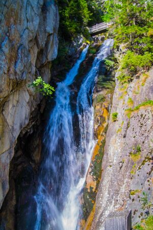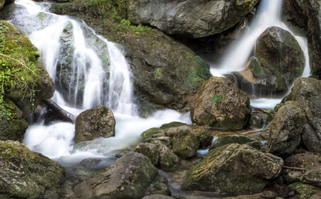 A lot of Waterfalls in the Wimbacklamm in Bavaria Berchtesgaden with stones and green plants and trees