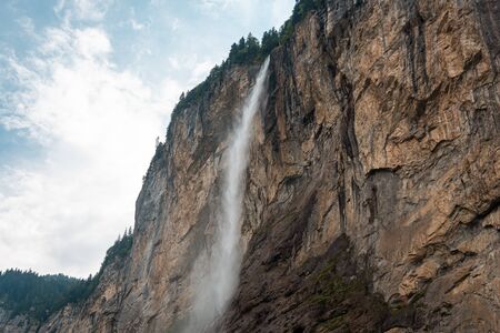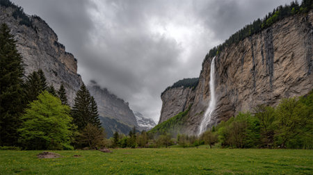 Waterfall flows down cliffs in Lauterbrunnen valley where green meadows meet steep rock faces and clouds cover the sky.