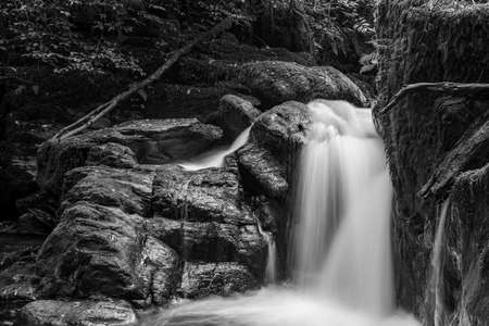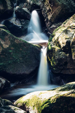Two-stage waterfall on the river Jedlova in the Jizera Mountains, Czech Republic. Slow-motion. The rays irradiate the water to white.