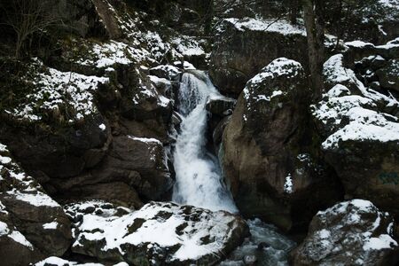 Winter Landscape, River Waterfall Stones Ice Turkey Trabzon Karadeniz Black Sea. In the way to sumela monastery