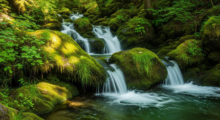 A tranquil scene showcasing a gentle stream flowing over moss-covered rocks, surrounded by lush greenery in a serene forest environment, inviting relaxation.