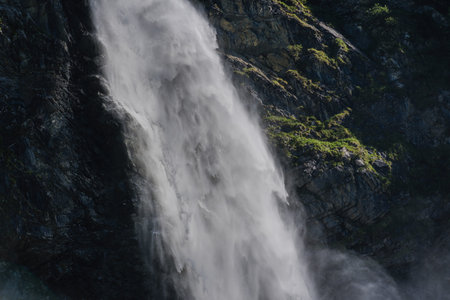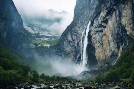 the photo showcases a mesmerizing waterfall in a dark and foreboding landscape. with its photorealistic artistry and birds-eye-view perspective, this 32k uhd image captures the beauty and intricacy of the norwegian nature. the composition exudes a sense of mystery and awe, immersing viewers in the photorealistic detail of the cascading waterfalls. ai generated