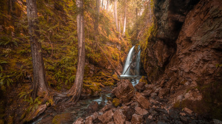 A landscape of a small waterfall with long exposure in a forest under the sunlight in autumn