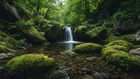 Serene Forest Waterfall with Flowing Stream and Mossy Rocks