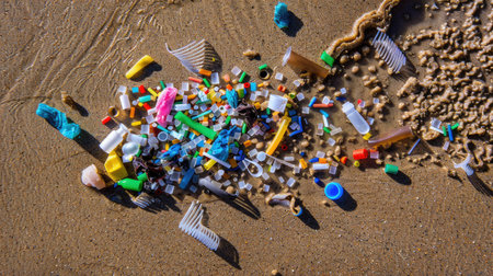 A vivid collection of plastic waste and debris scattered across a sandy beach, illustrating environmental pollution and the need for sustainable practices.