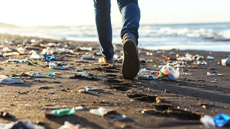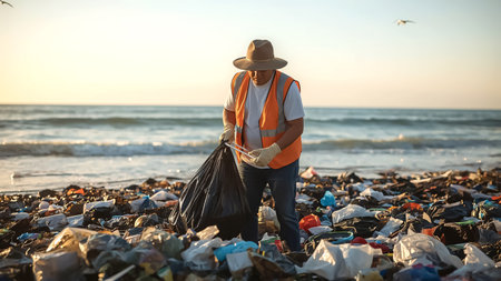 Man in a high-visibility vest collecting plastic waste on a polluted beach, promoting efforts to reduce environmental damage and support ecological sustainability for World Cleanup Day and Earth Day.